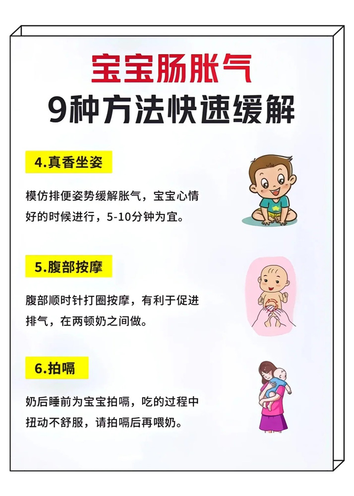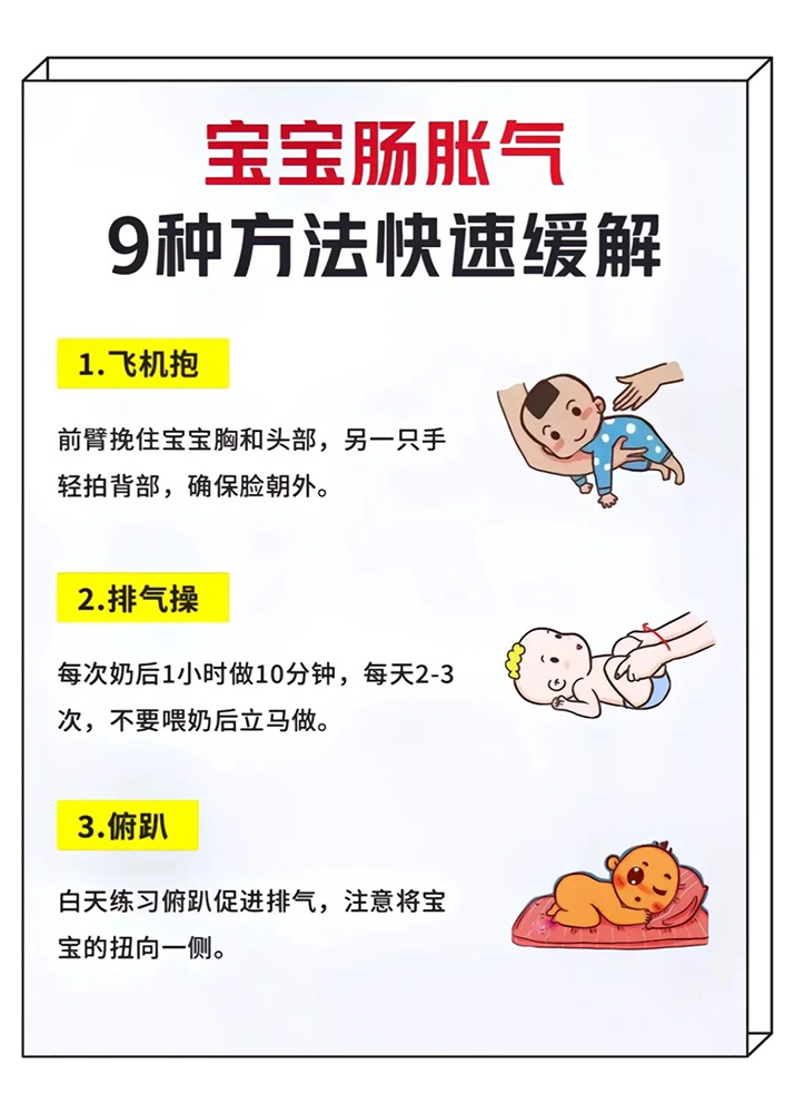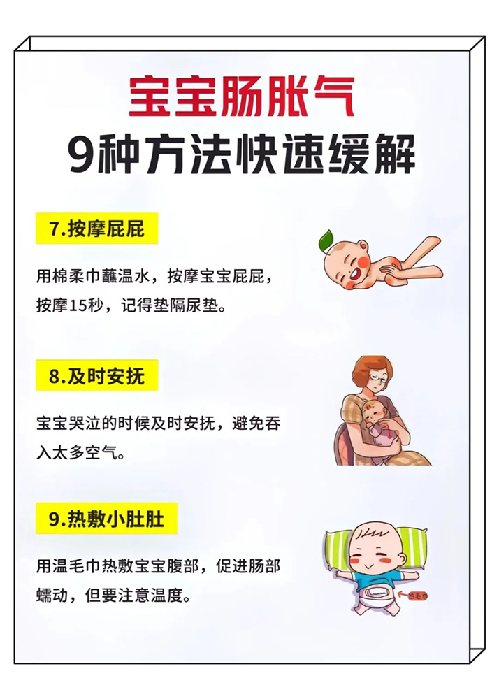 2.顺时针按摩小肚子顺时针按摩宝宝小肚子,简单的给腹部一些压力,在宝宝躺着或者趴着的时候,抓住宝宝的小腿让他屈膝,膝盖抵住小肚子,慢慢的宝宝就会放出屁来,宝宝就会舒服许多。