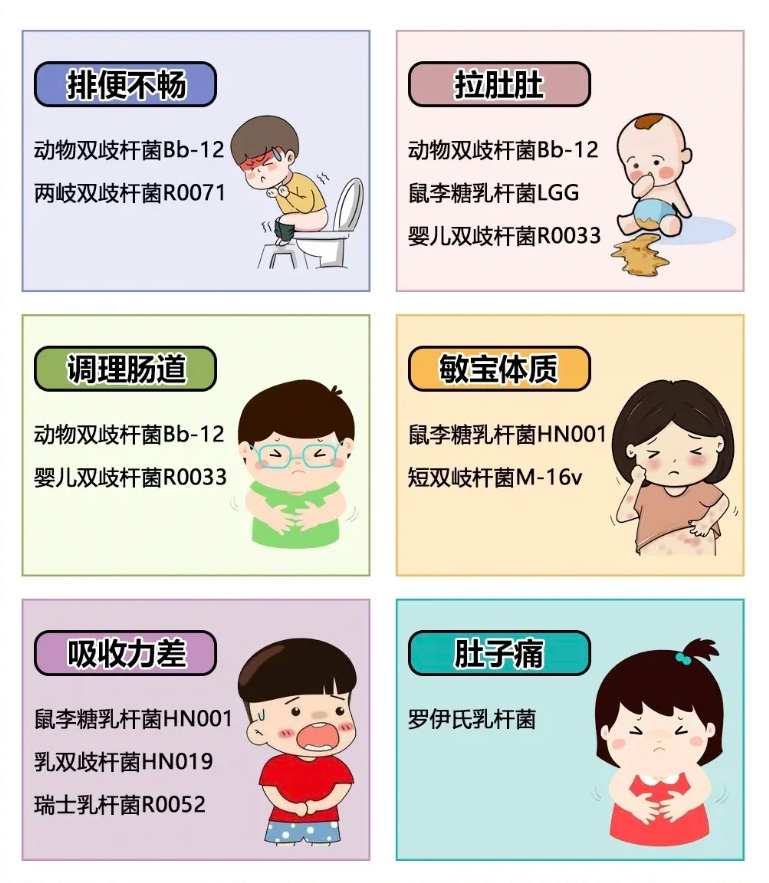 家长可以观察孩子的身体情况和便便情况(是否有奶瓣等),选择对应功效的菌株。